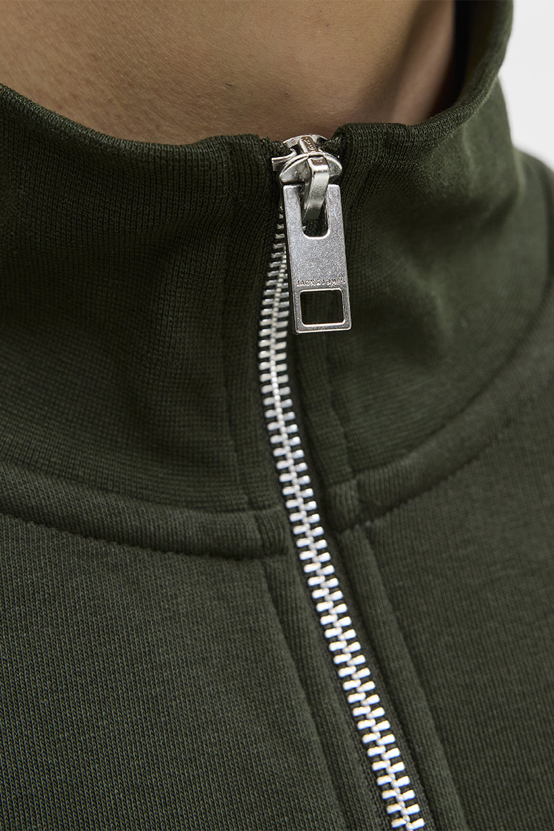 - Le sweat possède un col montant zippé et des bords côtes aux manches et à la taille