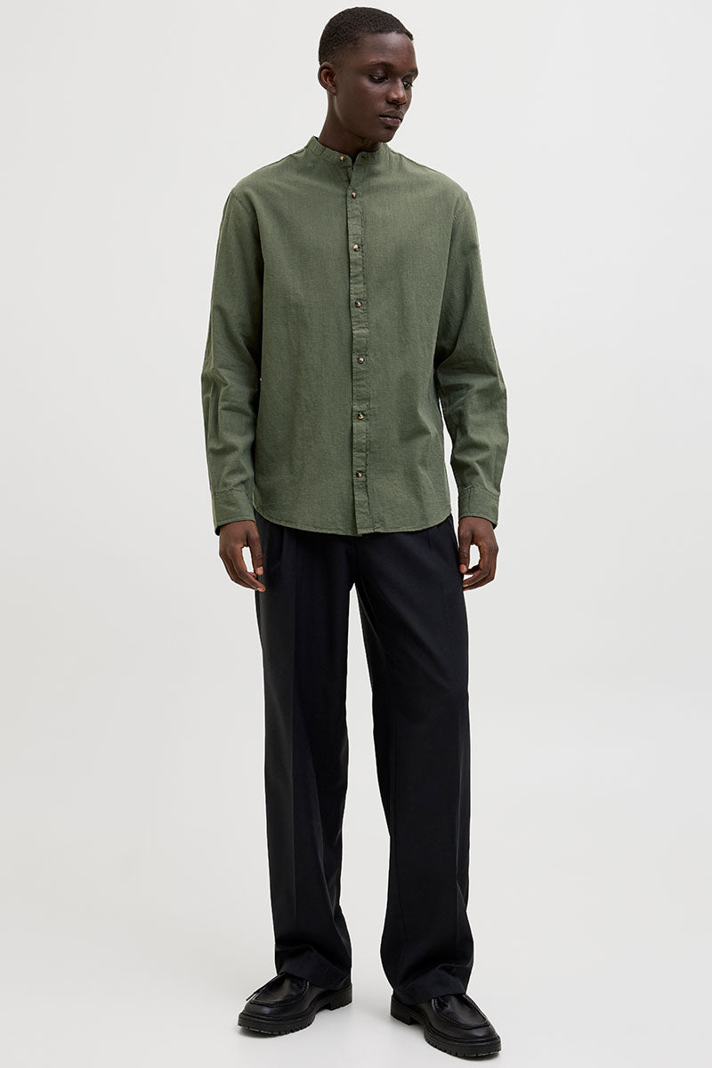 - Chemise verte foncée à manches longues en lin, coupe confort