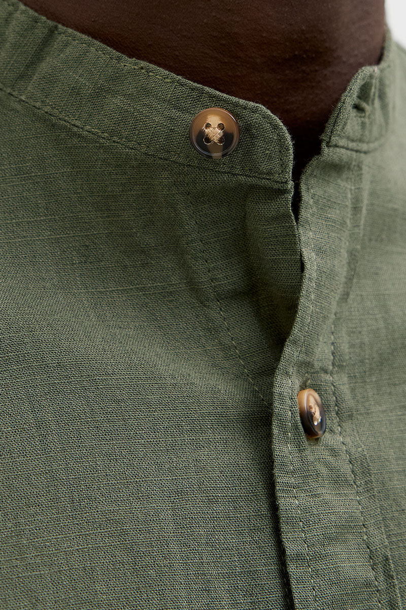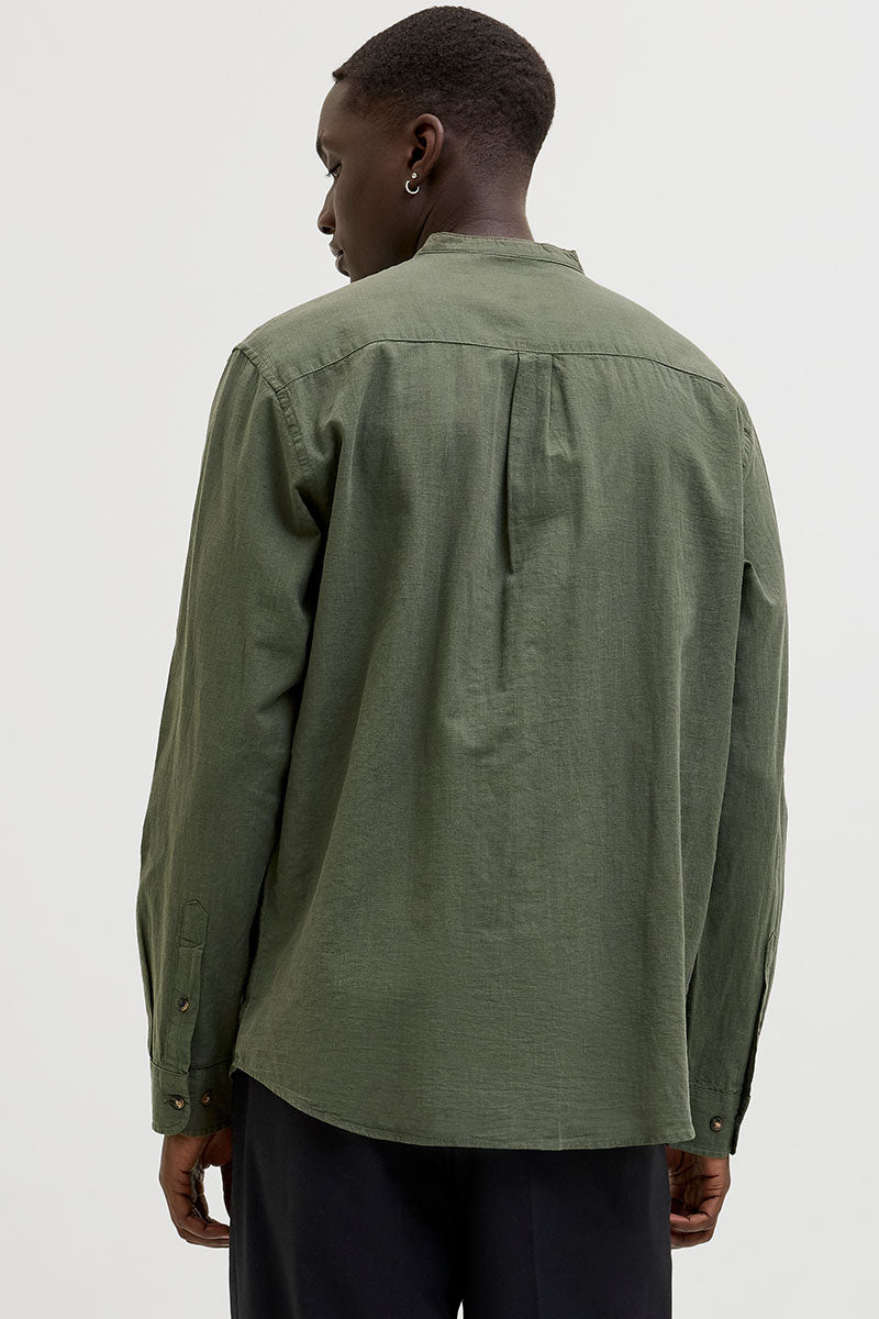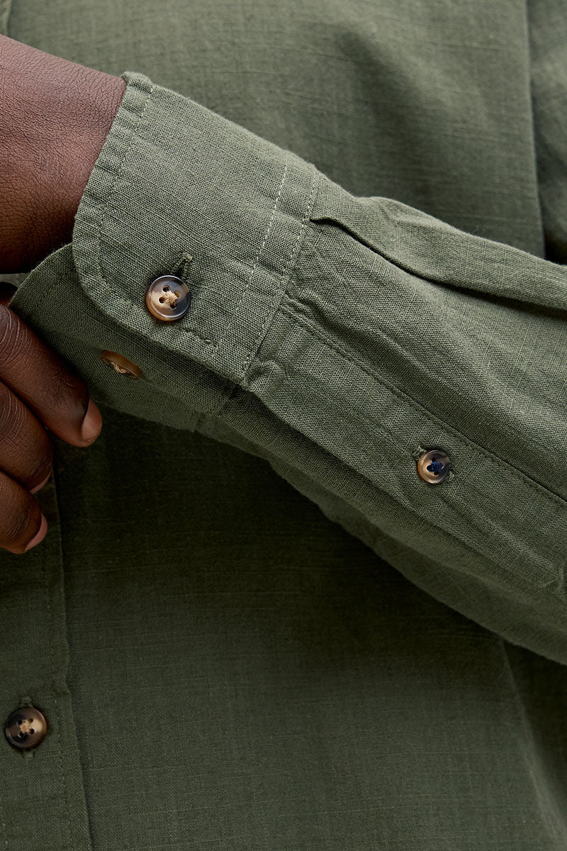- Chemise verte foncée à manches longues en lin, coupe confort